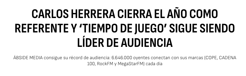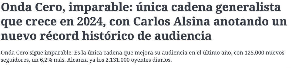 - Si los datos de tu emisora principal son muy malos, pones el acento en el comportamiento del grupo al que pertenece. Así, si tu grupo (Atresmedia, Prisa, Ábside) tiene otras emisoras a las que sí le sha ido bien, pues ya lo tienes arreglado: «El grupo sube un XX por ciento… y tal y tal».